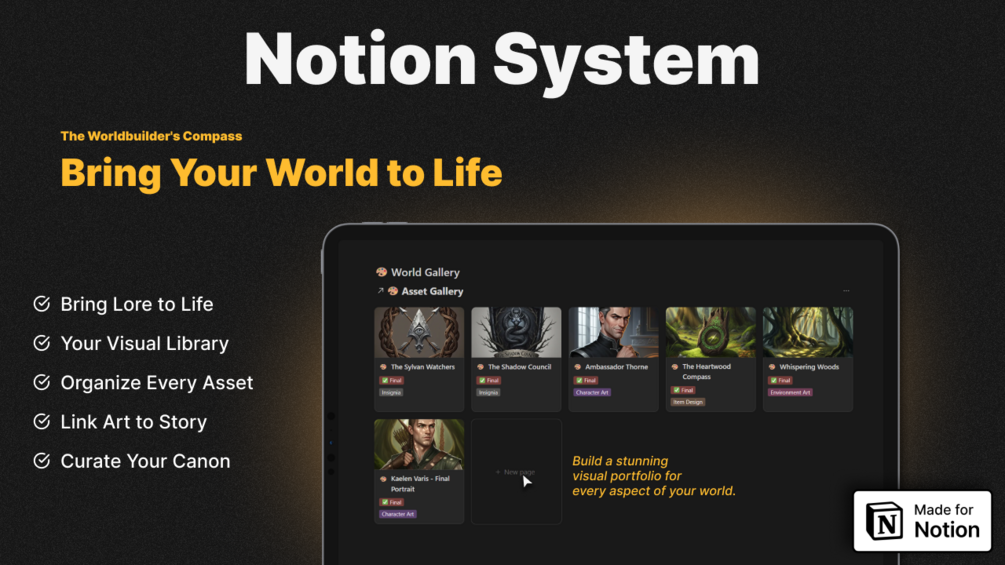 • 🎨 A Visual Asset Gallery: Organize all your concept art, maps, and final illustrations in a central, easy-to-browse portfolio.