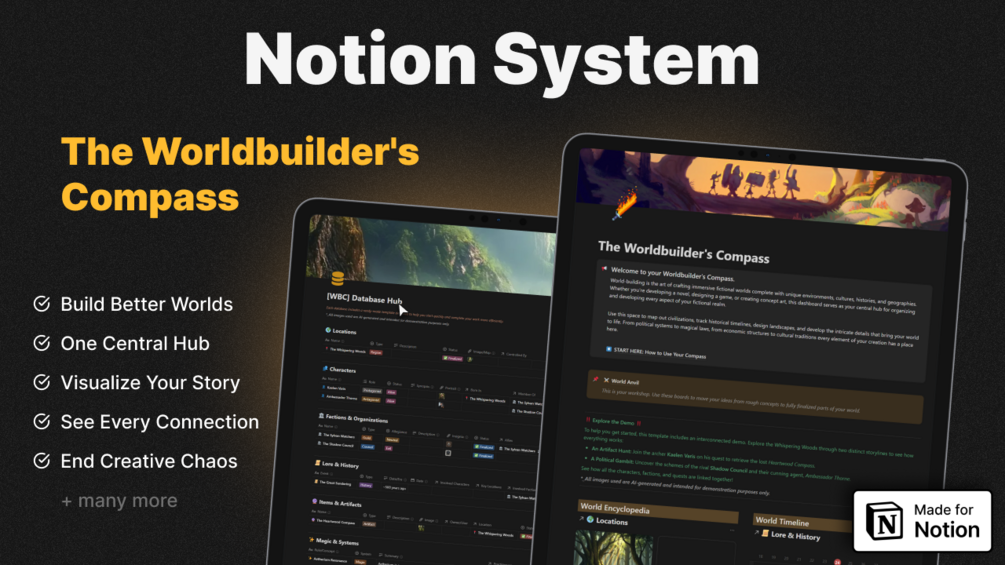 The Worldbuilder's Compass is the all-in-one Notion dashboard designed to be the single source of truth for your entire fictional realm. Stop juggling notes and start creating.